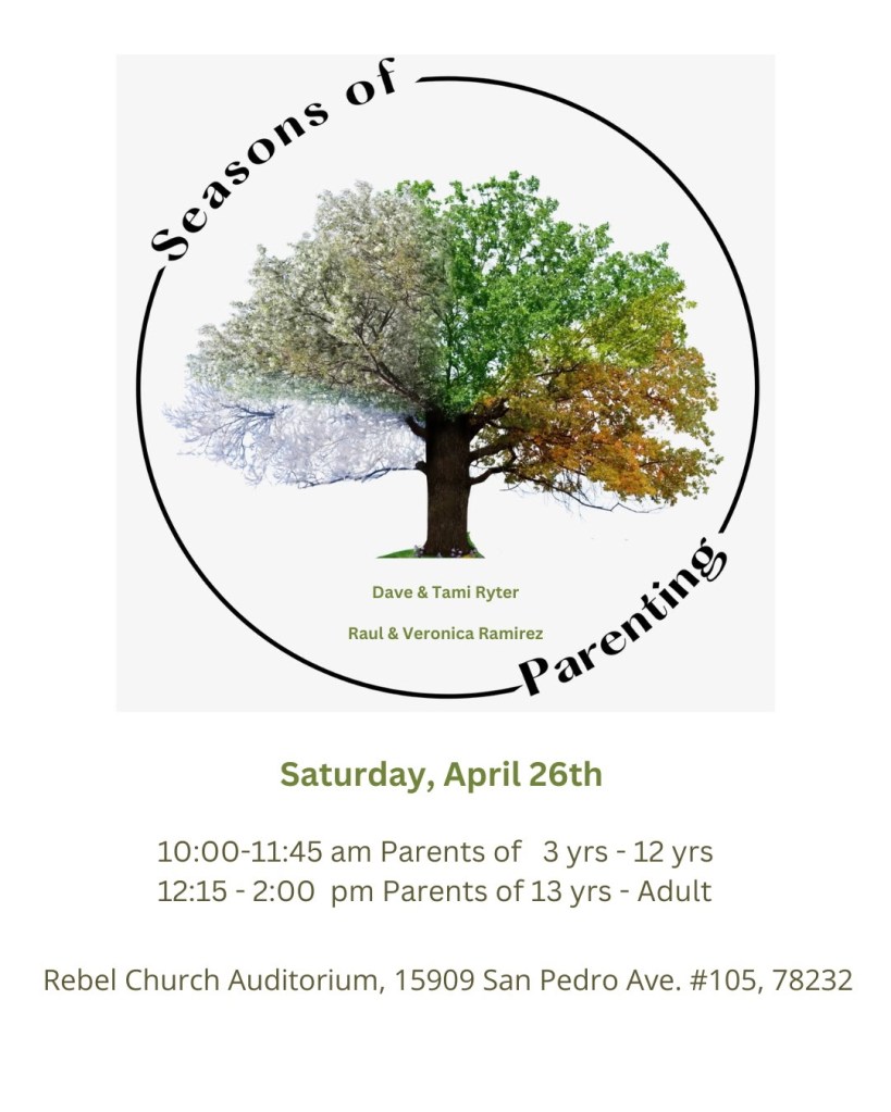 Mark your calendar for a parenting workshop on April 26 at the Rebel Church Auditorium in San Antonio… See the invite below.