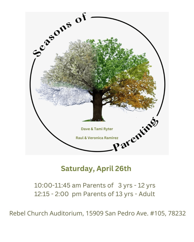 Mark your calendar for a Mission Point Parenting Workshop on Saturday, April 26. We’ll be using the Rebel Church Auditorium in San Antonio… See the invite below.